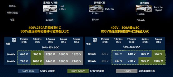 在電動汽車高壓化演變的趨勢下,迫切需要充電樁能夠提升充電電壓上限至1000V,以支持在未來普遍應(yīng)用的高壓車型。根據(jù)理論分析,對于90kWh配置鋰電池(續(xù)航約700公里),以1080V/最大500A高電壓平臺進行充電,最大充電功率540kW,達到6C充電能力,10分鐘可將電池充滿。據(jù)市場信息了解,廣汽、小鵬、蔚來等主機廠,均已經(jīng)在進行高倍率充電電池包和新車型(支持4C~6C)的規(guī)劃。